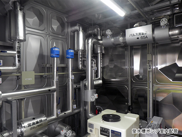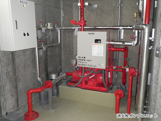 世間一般で云う建物の水廻り設備のほか、消火栓・スプリンクラー設備等の防災設備。