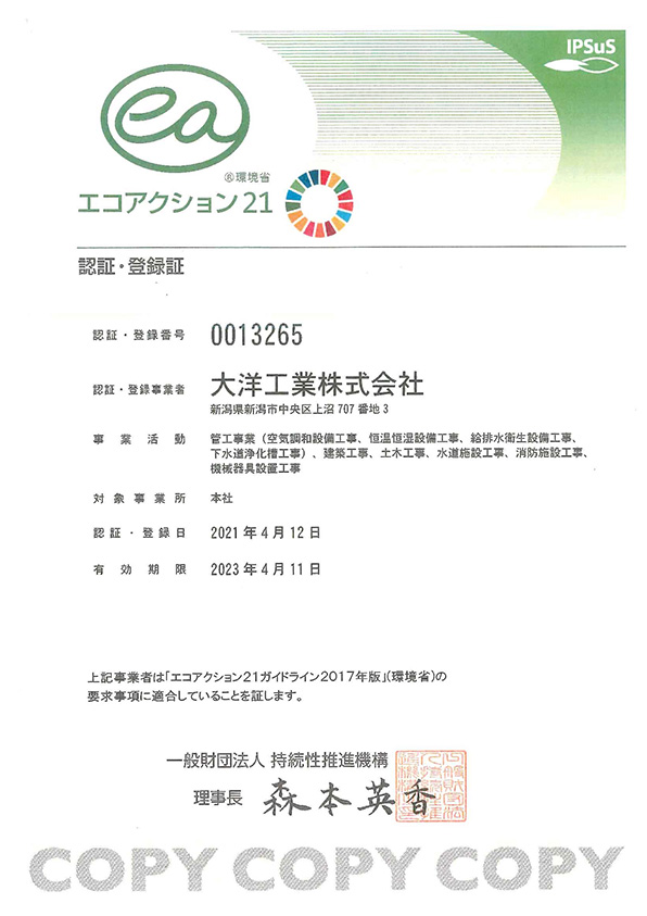 エコアクション21ガイドライン2017版適合事業所として認証されました。