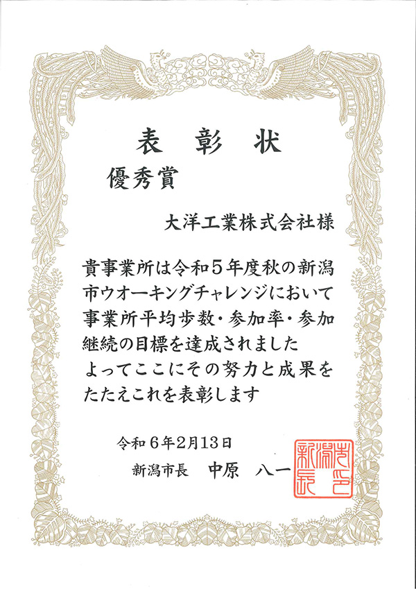 令和5年度秋の新潟市ウオーキングチャレンジで優秀賞を受賞しました。