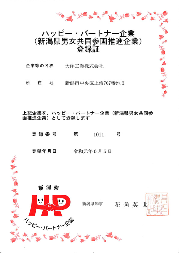 ハッピー・パートナー企業(新潟県男女共同参画推進企業)に登録されました。