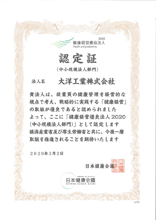健康経営優良法人2020(中小規模法人部門)に認定されました。